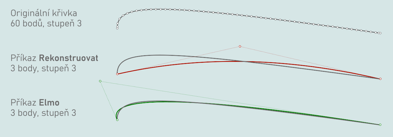 Příkaz Rekonstruovat je skvělý, pokud chcete zjednodušit (nebo naopak zesložitit) křivky nebo plochy a dělá to skvěle. Jediným problémem ale je, že ze své podstaty (mění parametrizaci křivky na unifmormní, ale to je zase na jiné vyprávění) křivky docela dost mění. Pokud pomocí rekonstrukce zjednodušujete křivky, které jsou tvarově složité, může být změna celkem drastická. Nový příkaz Elmo se snaží křivky zjednodušit na zadaný počet bodů, ale tak, aby se jejich tvar oproti originálu změnil co možná nejméně:
