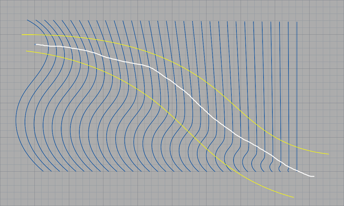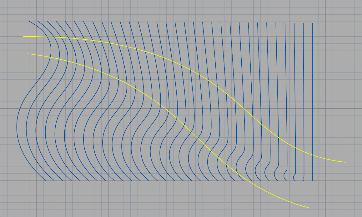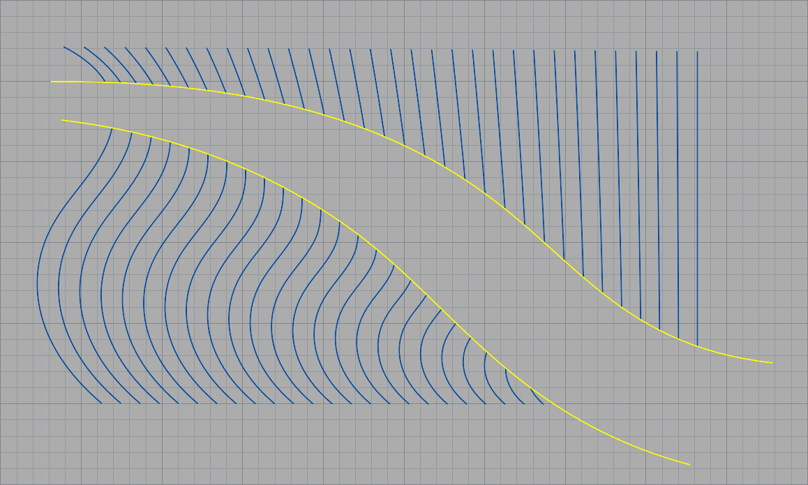 Příkazy Stříhat a Prodloužit nyní obsahují novou volbu Fence, která umožní vybrat stříhané nebo prodlužované části objektu tažením čáry nebo lomené čáry. Pokud klikáte, kreslíte lomenou čáru, pokud držíte levé tlačítko myši trvale stisknuté a táhnete myší, kreslíte čáru. Oba způsoby můžete přitom libovolně kombinovat. Na následujících obrázcích je příklad stříhání s volbou Fence. Chci vystřihnout část vertikálních křivek, která je vymezena dvěma žlutými horizontálními křivkami coby střihacími nástroji. V Rhinu 8 mám dvě možnosti, jak vyklikat stříhané části vertikálních křivek - buď klikáním na křivky jednu po druhé (moooc práce) nebo tažením okna zprava doleva, abych vybral více křivek najednou. Jenže oblast stříhání je zakřivená a okno je pravoúhlé, proto můžu oknem vybrat vždy je pár křivek najednou. S volbou Fence je práce mnohem zábavnější: