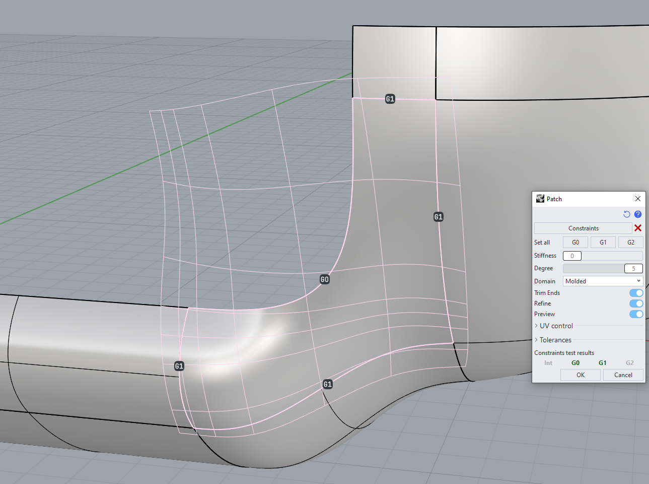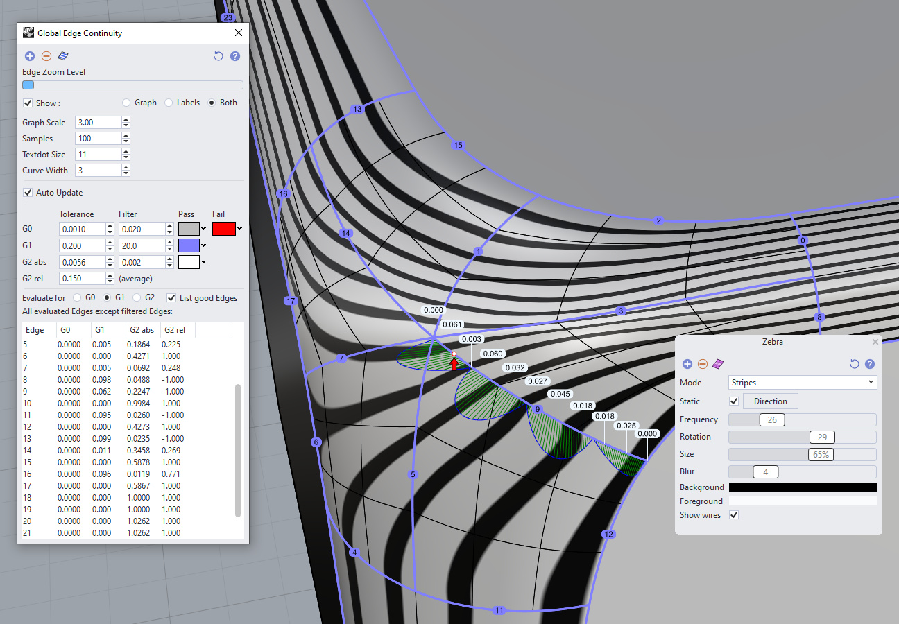 Nový příkaz GlobalEdgeContinuity analyzuje spojitost většího počtu sousedních ploch podél jejich společných hran. Spojitost je analyzována v rozmezí G0 až G2 a plochy mohou, ale nemusí být spojené.