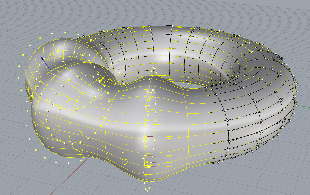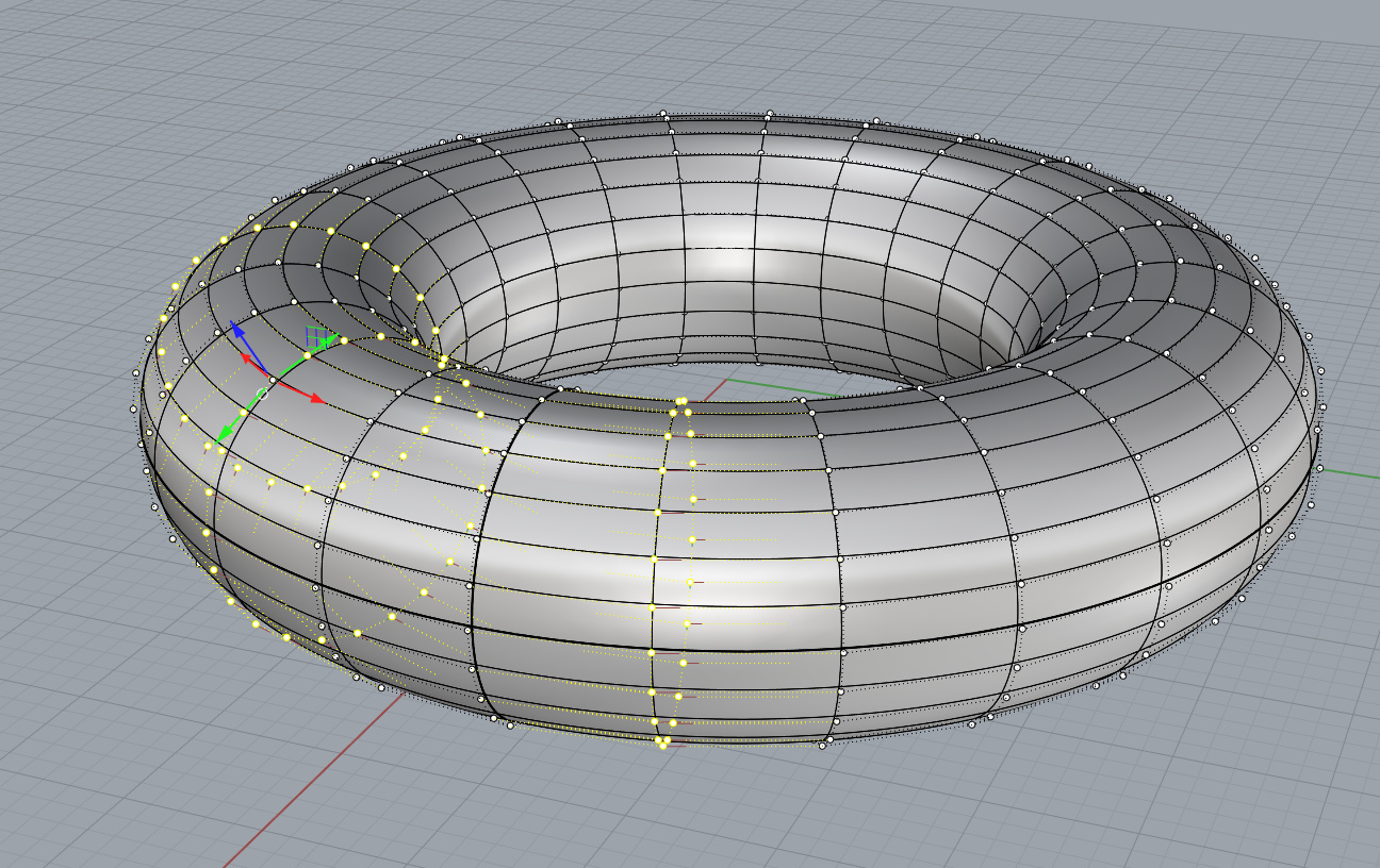Na následujícím obrázku jsou vybrány tři prstence řídicích bodů. Všimněte si, že na Gumballu jsou dvě červené a dvě zelené šipky - pro tažení v kladném a záporném směru U a V. Při tažení se každý vybraný bod bude pohybovat ve svém vlastním směru U nebo V.
