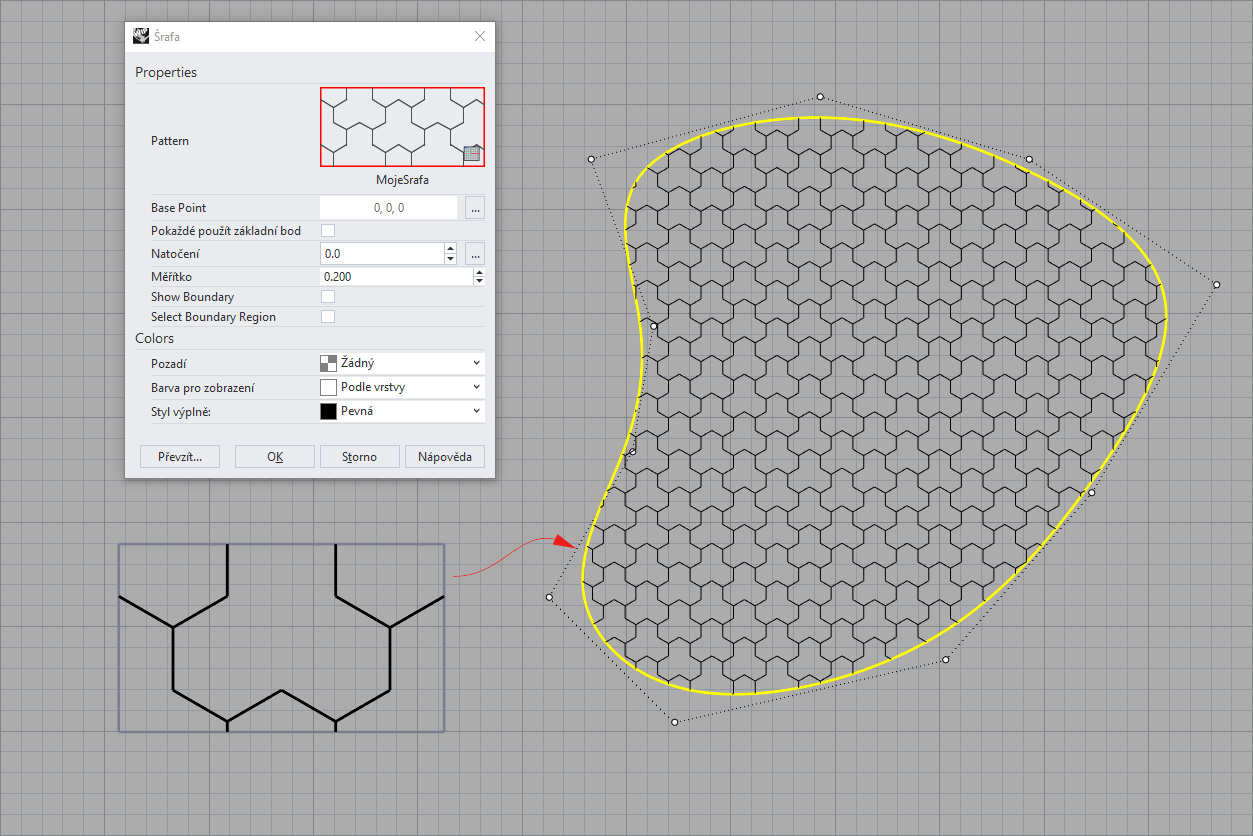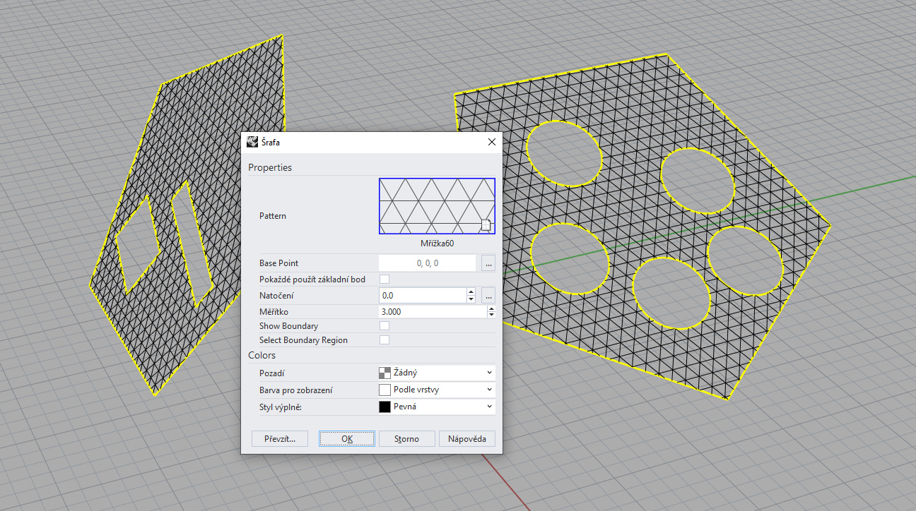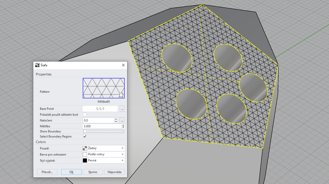 Pomocí nového příkazu HatchPattern si můžete jednoduše definovat vlastní vzor šraf, který si nakreslíte v 2D pohledu Rhina a následně jej tímto příkazem vyznačíte oknem, vyberete křivky vzoru a vzor pojmenujete. Pak už ho můžete používat v příkazu Šrafa jako jakýkoliv jiný šrafovací vzor - včetně změny měřítka, natočení nebo barvy: