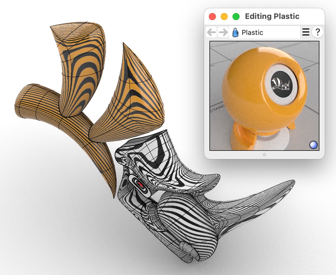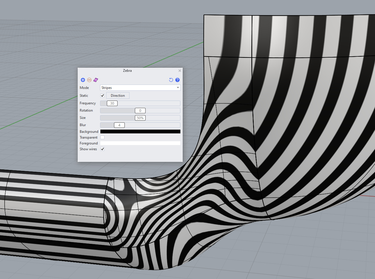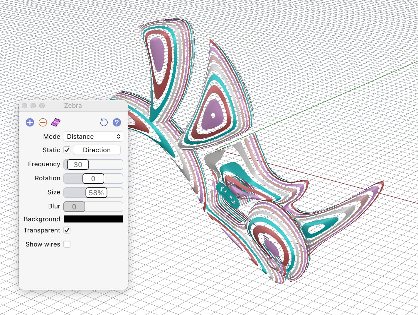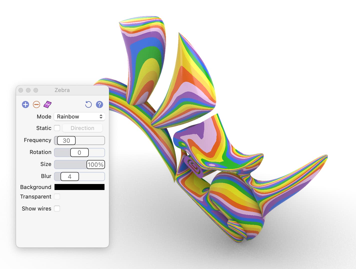 No, upřímně řečeno, teď už to klasickou zebru moc nepřipomíná, ale nové funkce jsou velice zajímavé a vychází vstříc pokročilejším designérům a automobilovým modelářům. Zebra nyní disponuje nejen různými barvami a dokonce i vzory (například tečky, mřížka nebo radiální vzor), ale umí také statické promítání vzorů na objekt, tyto vzory tedy nekloužou po povrchu, ale jsou neměnné bez ohledu na natočení modelu. Příkaz se jmenuje stále stejně - Zebra.