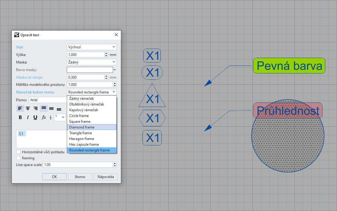 Anotační příkazy, jako OdkazováČára, Text nebo různé kótovací nástroje nyní disponují větším počtem tvarů rámečků. Rámečky mohou mít barevné výplně a to včetně průhlednosti: