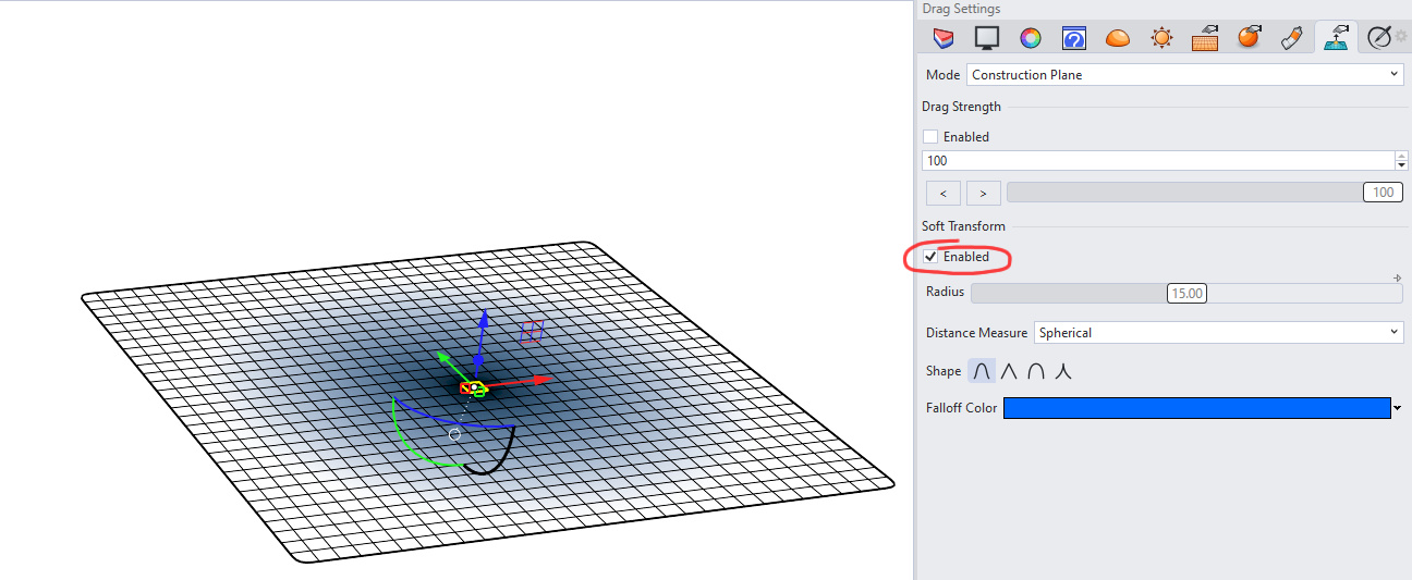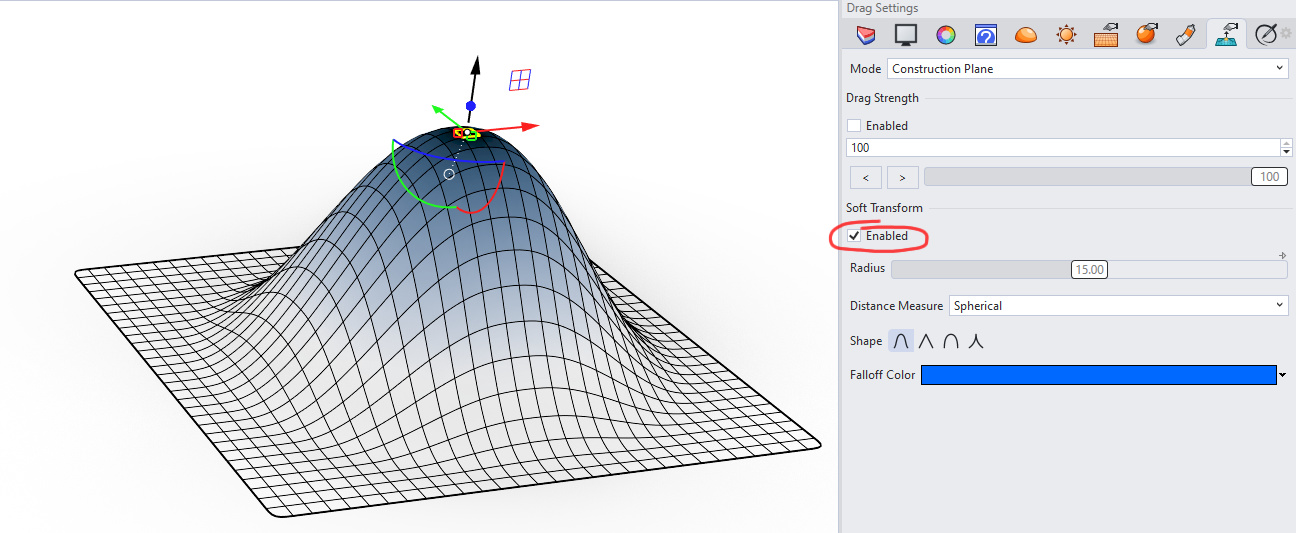 Technologie měkké transformace je (alespoň některým :) uživatelům známá už z Rhina 8. Tento příkaz ale neměl nějak oslnivé uživatelské rozhraní a jeho použití nebylo moc intuitivní. V Rhinu 9 WIP ale byly možnosti měkké editace značně rozšířeny co do funkčnosti i uživatelského komfortu. V kontejneru záložek v pravé části obrazovky Rhina je nyní dostupná nová záložka Drag Settings, ve které můžete měkké tažení zapnout a zvolit jeho parametry (dosah, tvar deformační křivky, barvu náhledu dosahu měkké transformace a další).
