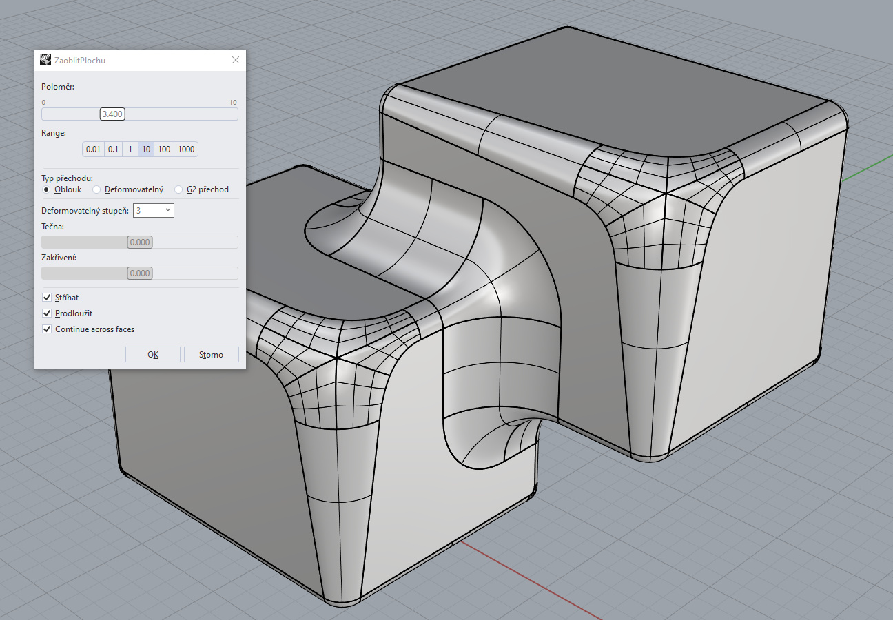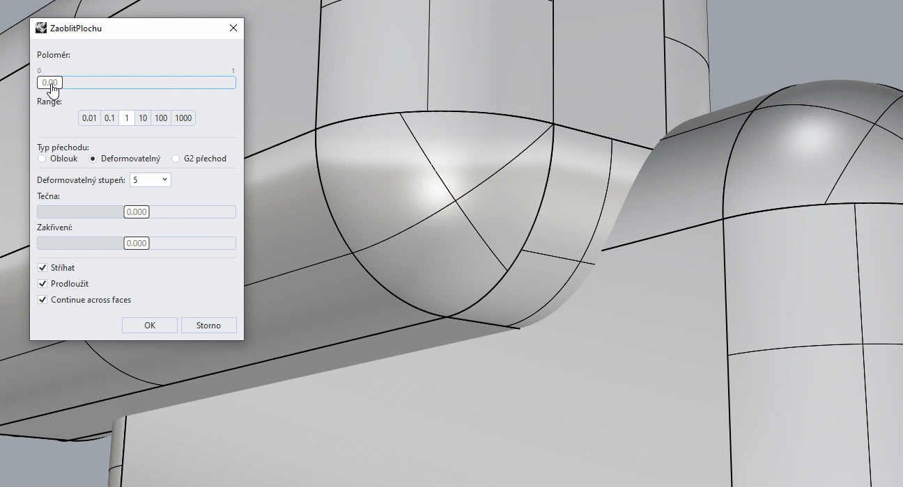 Že zrovna zaoblování v Rhinu není úplná krasojízda, to se mezi uživateli tak nějak tuší už posledních pětadvacet let. Vývojářský tým Rhina se rozrostl o nové posily a část se jich vrhla právě na tuto problematiku a první výsledky se už dostavují. Tyto funkce vám budou připadat jako z jiného světa. Příkaz ZaoblitPlochu (FilletSrf) nyní obsahuje volbu "Continue Across Faces", která umožňuje pokračovat automaticky v zaoblování podél tečných hran. Vše je interaktivní, jak vidíte na následujícím videu: