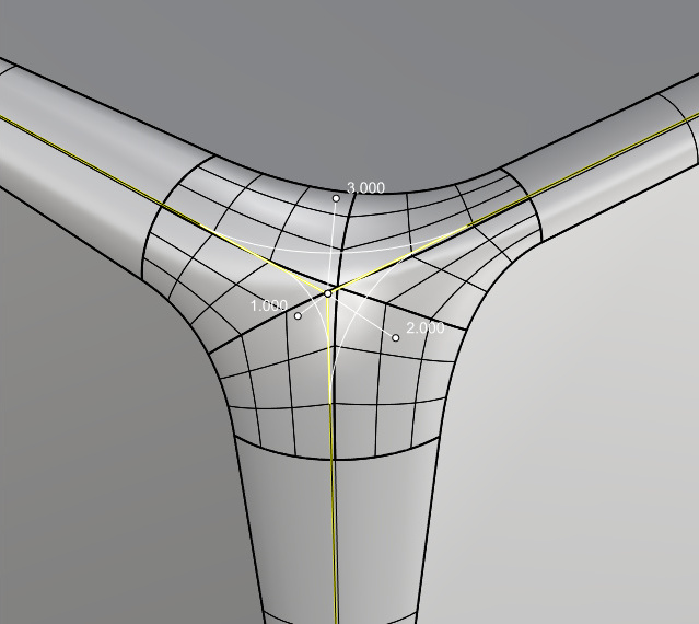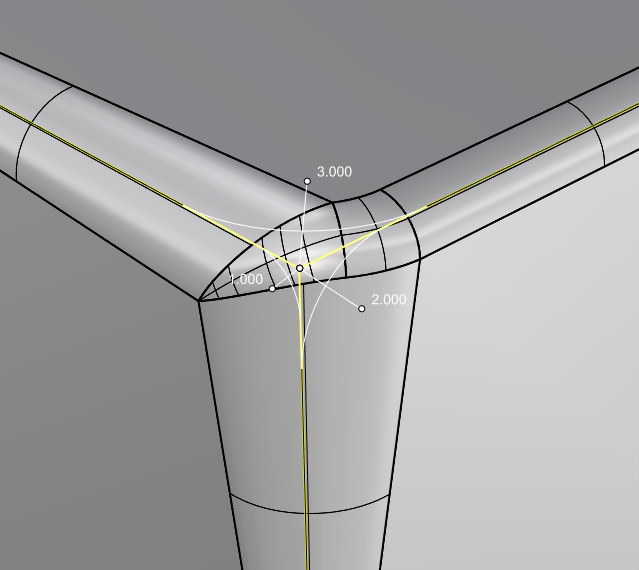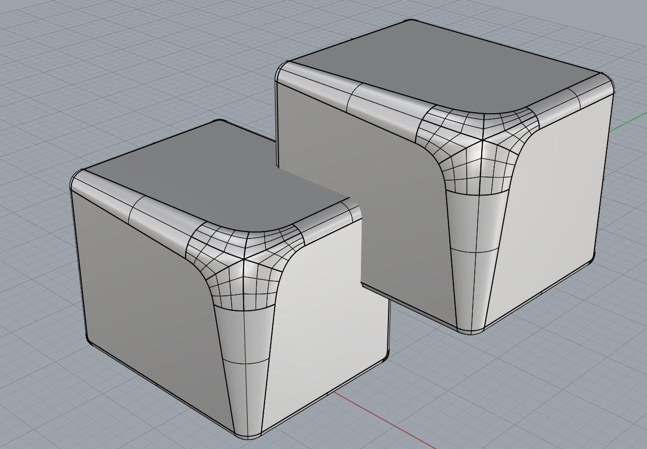 V příkazu ZaoblitHrany je nyní nově dostupná volba Setback=Yes/no, která, je-li aktivní, vytvoří "kufrový roh", viz následující obrázek. V Rhinu tato volba byla dostupná pouze u zaoblení plynulým přechodem, v Rhinu 9 je k dispozici i u klasického obloukového zaoblení.
