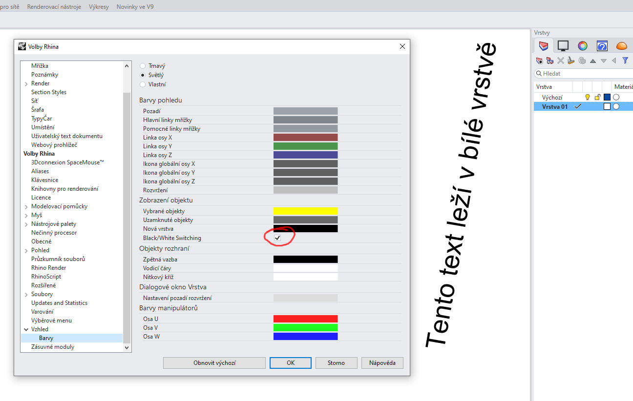 Další pomůckou je automatické přepínání barvy křivek a hran ploch mezi černou a bílou barvou v závislosti na jasu pozadí (tzv. black/white switch). Tato funkce zajišťuje automatickou úpravu barvy zobrazených křivek a hran objektů v závislosti na jasu pozadí tak, aby byly stále kontrastní a dobře viditelné. Přepnutí bílých křivek na černé proběhne v okamžiku, kdy jas pozadí přesáhne 70%, naopak černé křivky se přepnou na bílé, pokud jas pozadí klesne pod 30%. Na následujícím obrázku je text v bílé vrstvě, který by se standardně zobrazil bíle, ale díky tomu, že je v pohledu nastaveno bílé pozadí a v panelu Vzhled > Barvy byla zatržena volba Black/White Switching, přepnulo se zobrazení textu automaticky na černou barvu.
