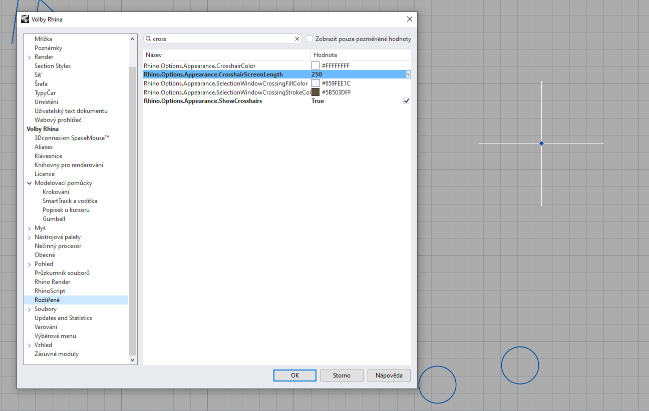 Rhino 9 přináší také různé malé pomocníčky, kteří vám usnadní kreslení a zobrazení čar. Mezi vylepšené funkce, které znáte už ze starších verzí Rhina, patří nitkový kříž (crosshair). Ten byl dříve standardně přes celou obrazovku, což každému nemusí vyhovovat. Ve volbách Rhina (záložka Rozšířené, kterou asi neznáte, ale je tam spousta užitečných voleb) lze nastavit délku nitkového kříže v pixelech. Hodnota 0 zobrazí nitkový křiž přes celou obrazovku. Níže vidíte nitkový kříž s nastavenou délkou 250 pixelů.