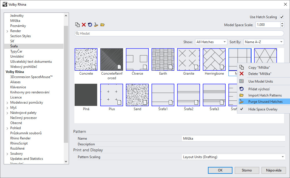 V Rhinu 9 je zcela přepracované okno pro správu šraf. Nyní obsahuje rychlou vizuální mřížku se vzory šraf, které můžete pohodlně třídit nebo prohledávat. Můžete vybírat více šraf najednou a na tyto výběry můžete aplikovat různé funkce pomocí pravého tlačítka myši.