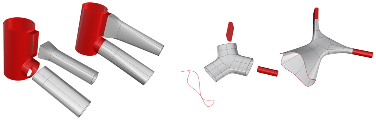 Na následujícím obrázku je několik příkladů napojení SubD ploch (světle šedé) na existující NURBS plochy (červené). U napojení je možné definovat tečnou (G1) návaznost. ​